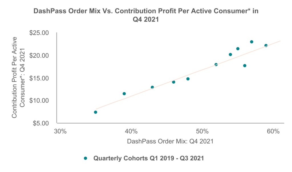 • On DoorDash’s 2021 Q4 Investor Letter (Feb 16, 2022), page 3, a chart displayed Contribution Profit per active consumer in Q4 2021.  That chart is a bit confusing, so in the earnings call, Prabir clarified that “the right side of the chart are the older cohorts” — that is, on the far-right side are two-year-old, three-year-old cohorts, and their quarterly Contribution Profits have reached ~$24 per active user.