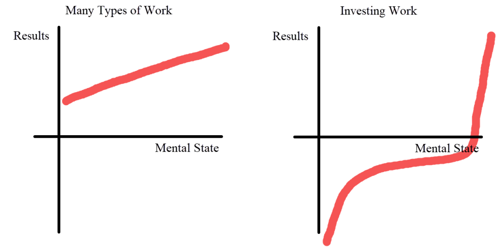 However, in investing, the relationship between one’s mental state and one’s investment results, I think, looks like the chart on the right-hand side. In a bad mental state, investors make bad moves; a couple of bad moves can result in a few large mistakes; a few large mistakes can compound into substantial losses (so the sinking of the red line to the left).