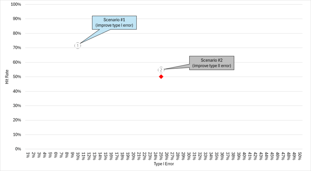 - Scenario #2: If Tom reduces his type II error rate from 25% to 10% (leaving type I error rate at 25%), Tom’s hit rate will increase from 50% to 55% — an improvement of 5 ppt.