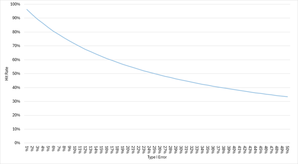 As the chart shows, the lower the type I error rate is, the higher the hit rate is. Now, locate the “40%” mark on the X-Axis and find the corresponding value on the Y-Axis — a hit rate of 38%! Repeat: If Tom’s type I error rate is 40% (instead of 25%), his hit rate drops from 50% (coin flipping) to 38%! That is worse than coin flipping, meaning if we stand next to Tom and watch him pick stocks, we are watching someone who is making wrong decisions most of the time!