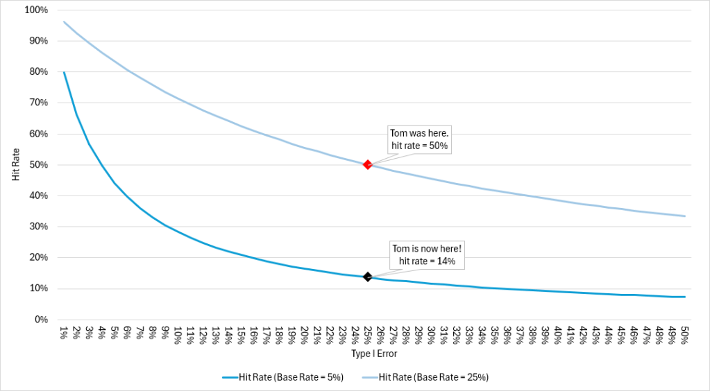 - Say, poor Tom wakes up one day and realizes that he is no longer in that 25% base rate world. Instead, he is in a new and more realistic world of 5% base rate. In essence, Tom moves from the light blue line to the dark blue line. Assuming Tom maintains his 25% rates for both type I error and type II error (he didn’t lose any skill during that night of sleep), Tom’s hit rate will collapse from 50% (the red dot on the chart) to 14% (the black dot)! For every seven stocks that Tom picks as good stocks, six of the seven are going to be bad stocks!