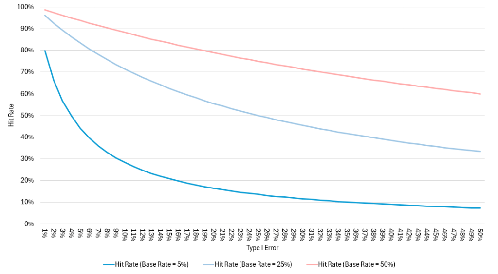Before we move on, a quick note on the chart. Since changes in type II error rate have minor influence on hit rate, the rest of the article will focus on changes in type I error rate. Thus, type II error rate will be held constant at 25% for all charts that are shown.